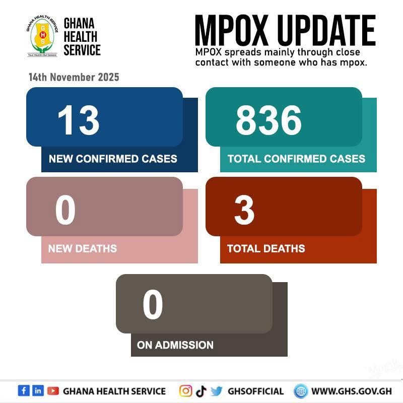 The GHS report indicates that 13 additional cases have been detected across various regions, raising the cumulative confirmed Mpox cases to 836.