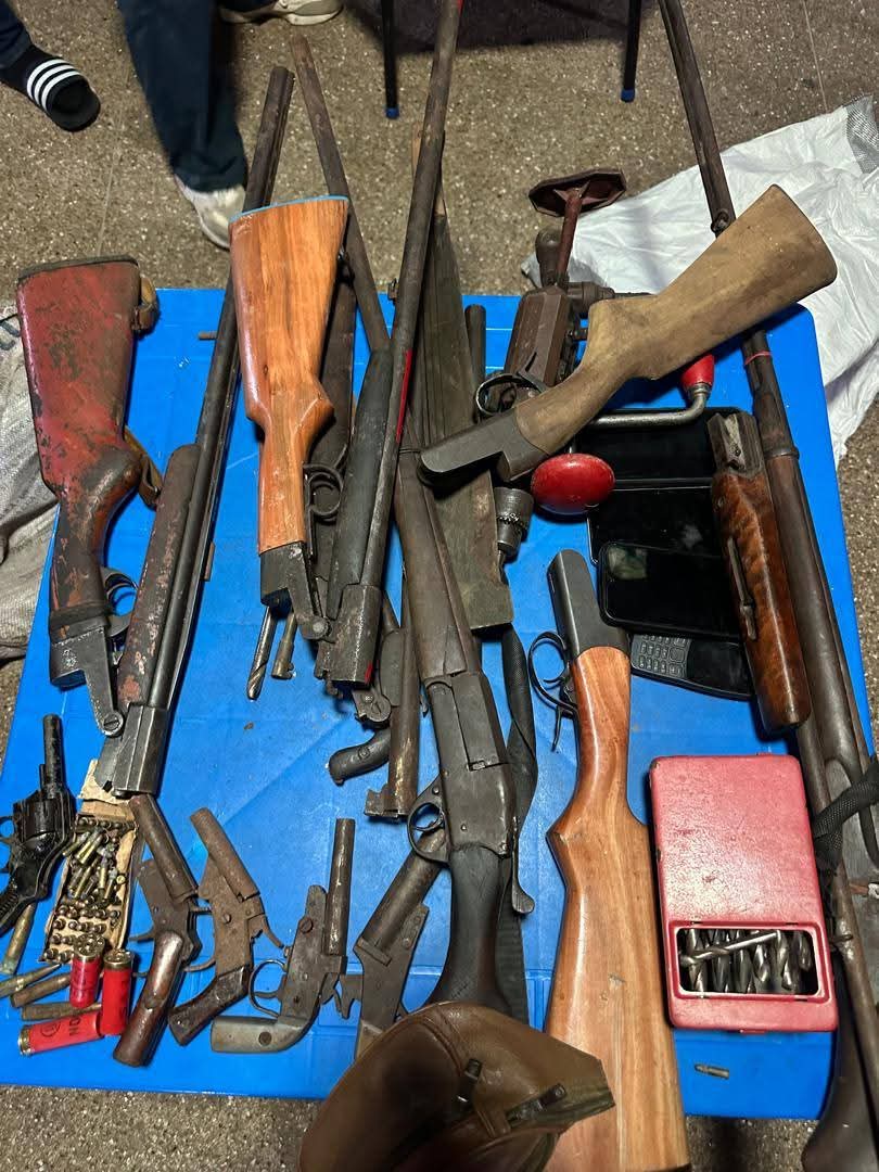 A subsequent search conducted on the suspects led to the retrieval of a significant cache of weapons and ammunition. Items recovered include seven single-barrel rifles, five locally manufactured pistols, one revolver, and assorted ammunition comprising 64 rounds of ACP ammunition, 11 rounds of AK-47 ammunition, and four rounds of 7.62 x 51 ammunition.