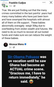 “True,” Franklin Cudjoe wrote, “We are just finding out that the many crimes committed in the last painful years had many many babies who have just been born and have swamped the hospitals with almost all of them on life support”.