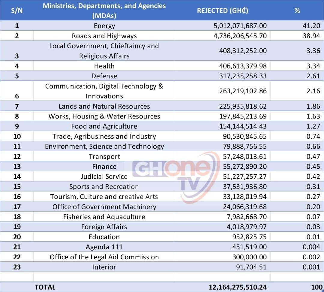 The Energy Ministry alone had claims amounting to GH₵5.01 billion (41.2%) rejected, while the Roads and Highways Ministry followed closely with GH₵4.73 billion (38.9%).