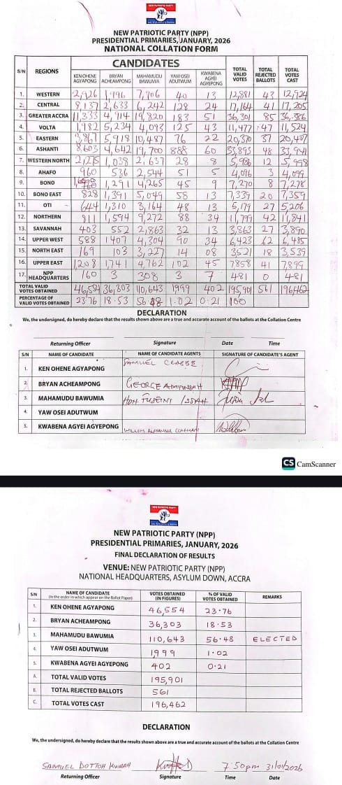 Dr. Mahamudu Bawumia has been officially declared the winner of the New Patriotic Party’s (NPP) presidential primary held on Saturday, 31 January 2026, securing a commanding 56.48 percent of the total valid votes cast.