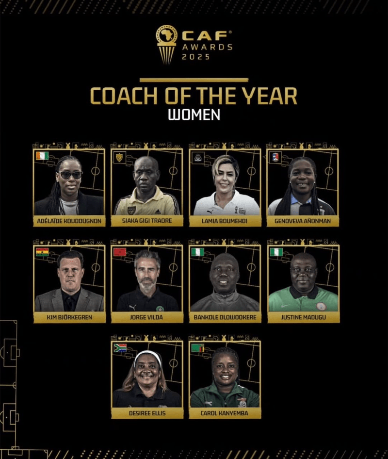 Other contenders include Côte d’Ivoire’s Adelaide Koudougnon, Morocco’s Jorge Vilda, South Africa’s Desiree Ellis, and TP Mazembe’s Lamia Boumehdi — all respected figures in the women’s game.