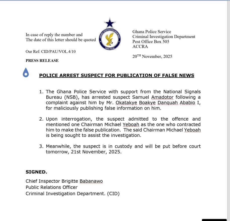 According to an official statement issued by the Criminal Investigation Department (CID) on 20 November 2025, the action was triggered by a complaint filed by Okatakye Boakye Danquah Ababio I, who accused Amadotor of publishing false and damaging content about him.