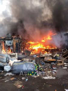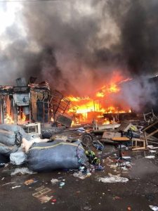 According to eyewitnesses, the fire started at the Blue Light arena near Hello FM in the Railways area and spread rapidly before fire officers arrived to contain the situation.