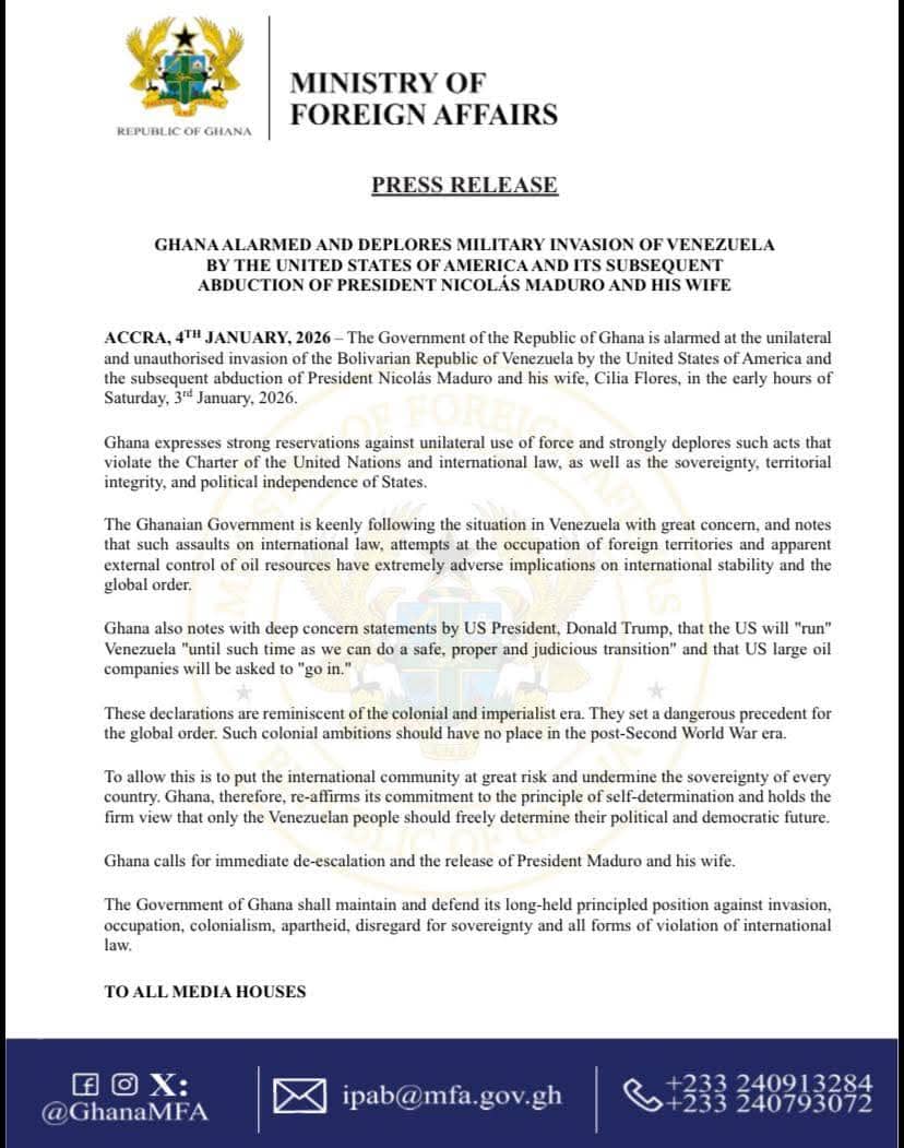 In a strongly worded presFs release issued by the Ministry of Foreign Affairs on January 4, 2026, Ghana said it was alarmed by what it termed the unilateral and unauthorised military invasion of Venezuela by the United States and the subsequent abduction of the Venezuelan leader and First Lady in the early hours of Saturday, January 3.