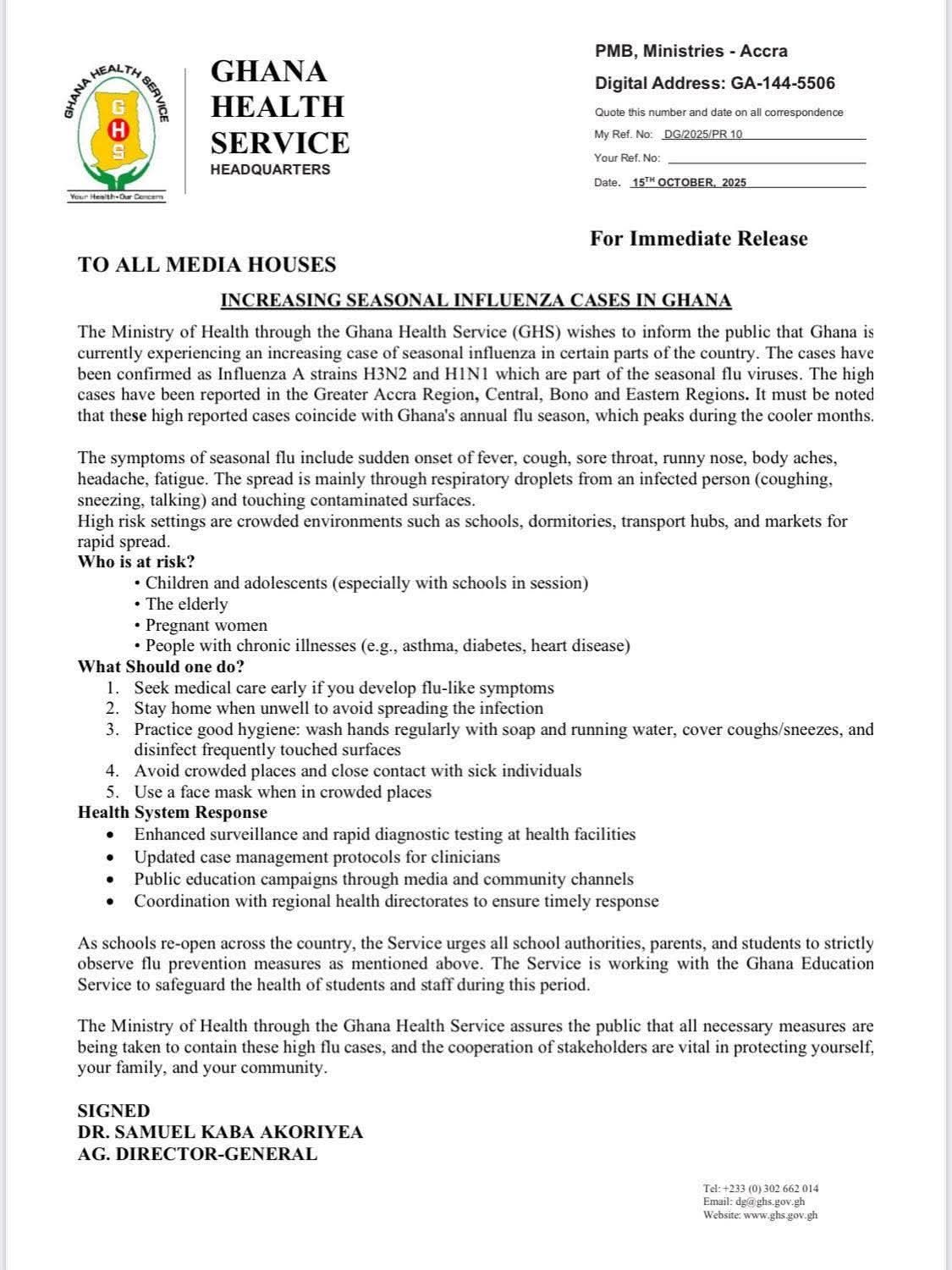 In an official statement signed by the Acting Director-General of the GHS, Dr. Samuel Kaba Akoriyea, and issued on Wednesday, October 15, 2025, the Service confirmed that the current outbreak involves two major strains of the influenza virus — Influenza A (H3N2) and H1N1 — both of which are common causes of the seasonal flu globally.