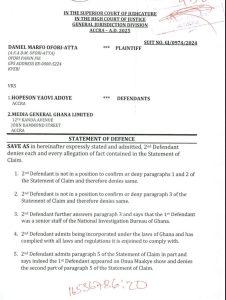 In a statement of defence filed by Hopeson Adorye, “Defendant denies each and every allegation of fact contained in Plaintiff’s Writ of Summons and Statement of Claim.”