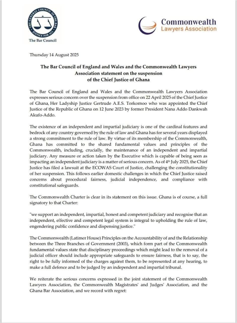 Two leading international legal organisations—the Bar Council of England and Wales and the Commonwealth Lawyers Association (CLA)—have jointly issued a strongly worded statement expressing grave concern over the continued suspension of the Chief Justice Gertrude Araba Esaaba Sackey Torkornoo.