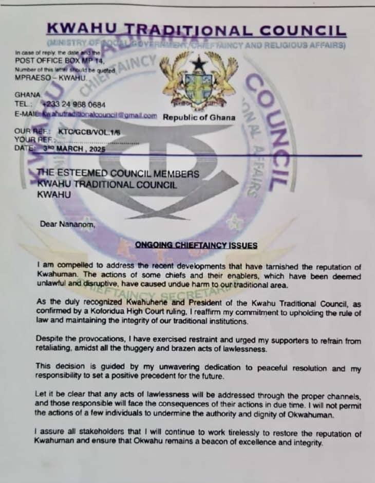 “As the duly recognized Kwahuhene and President of the Kwahu Traditional Council, I reaffirm my commitment to upholding the rule of law and maintaining the integrity of our traditional institutions,” the Kwahuhene stated.