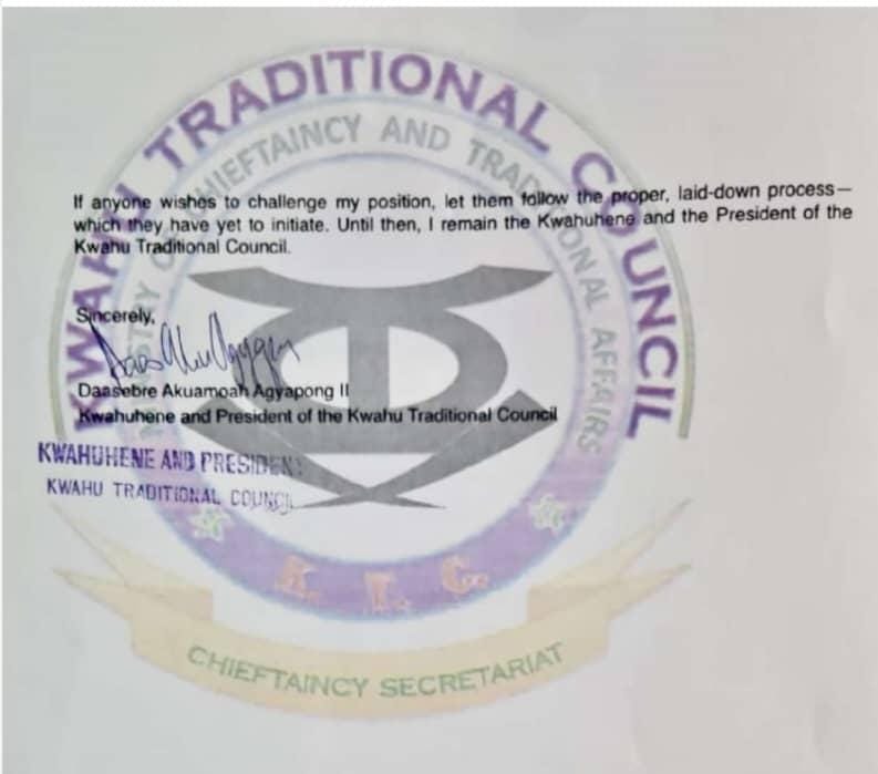 “To those who wish to challenge my position, let them follow the proper, laid-down process, which they have yet to initiate. Until then, I remain the Kwahuhene and the President of the Kwahu Traditional Council.”