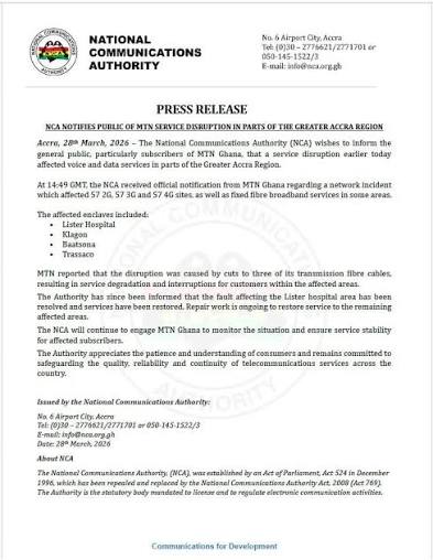 In a press release issued on March 28, 2026, the NCA—not MTN Ghana—took the lead in informing the public about a network failure that disrupted voice, data, and fibre broadband services in several areas.