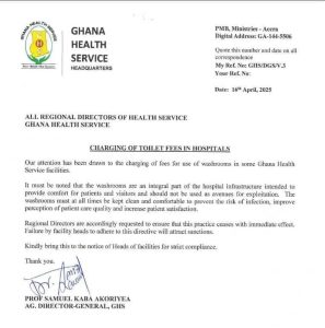 The Ghana Health Service (GHS) has issued a firm directive banning the collection of toilet usage fees in all its health facilities across the country.